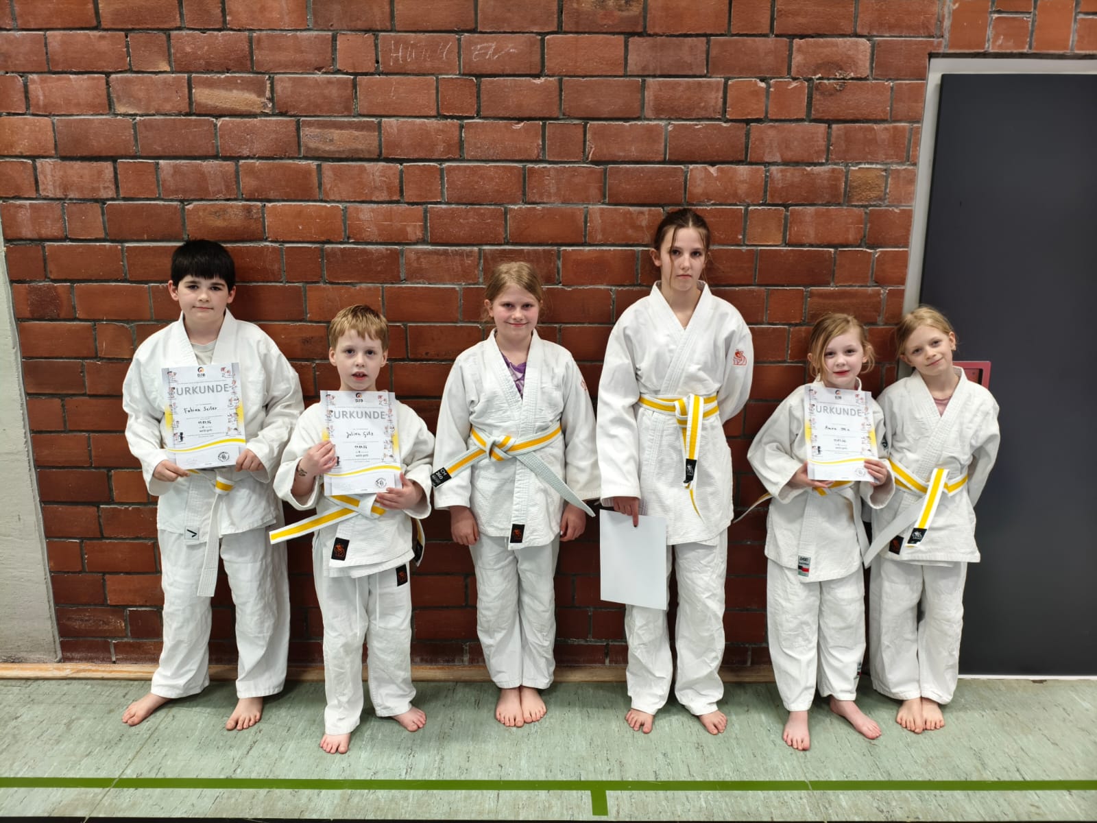 Große Freude bei den Judoka des TV Mettingen: Fabian Seiler, Emilia Wehmann, Julian Götz, Amira Otte sowie Ina und Jule Tietmeyer haben erfolgreich ihre Prüfung zum weiß-gelben Gürtel abgelegt.