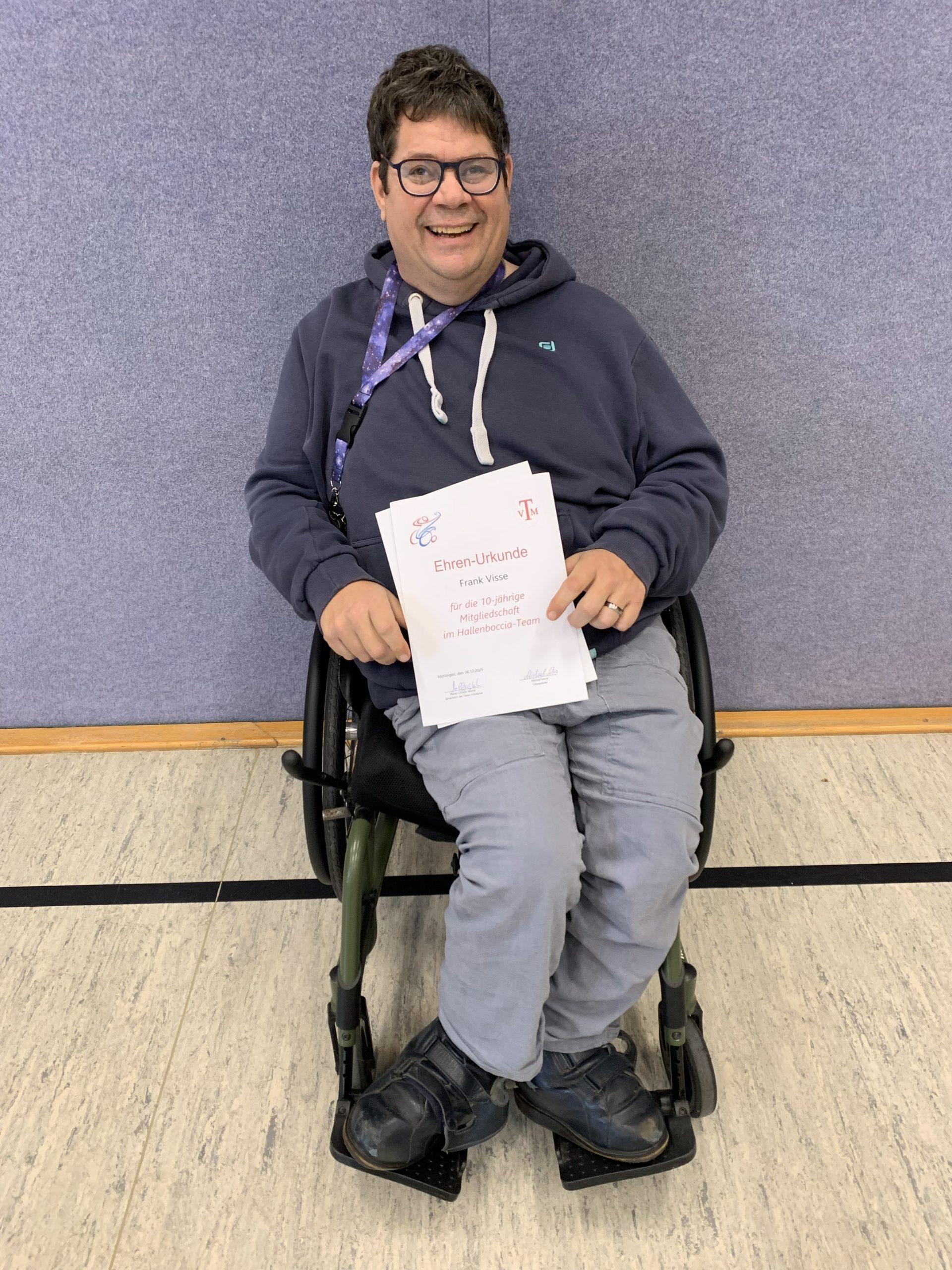 Im Anschluss an den Wettkampf wurde Frank Visse für seine zehnjährige Mitgliedschaft im Boccia-Team mit einer Ehrenurkunde ausgezeichnet. Der TV Mettingen gratuliert herzlich und bedankt sich für sein langjähriges Engagement im Team.